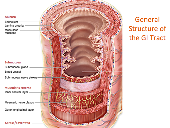 Basically the GI tract is just a tube with four concentric layers, like this: