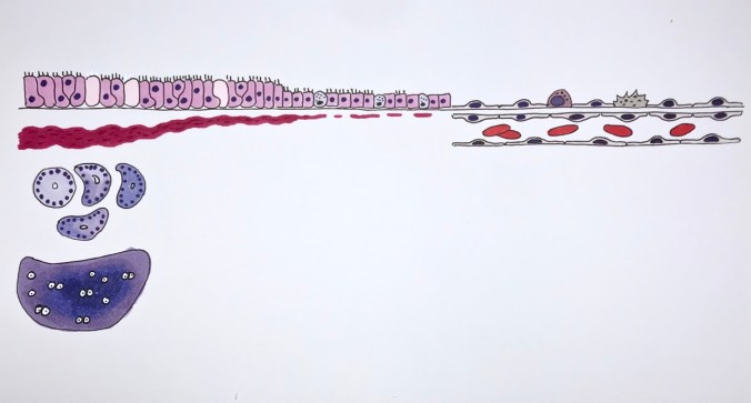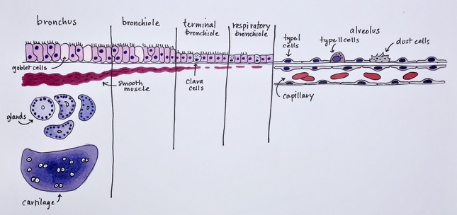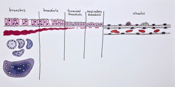 Here’s a drawing I made showing how the wall of the respiratory tree changes as you go from bronchi to alveoli. There are three versions, so you can use it fully labeled, partially labeled, or unlabeled, however it suits you best. Let me know if you find it useful – if so, I’ll make more 🙂