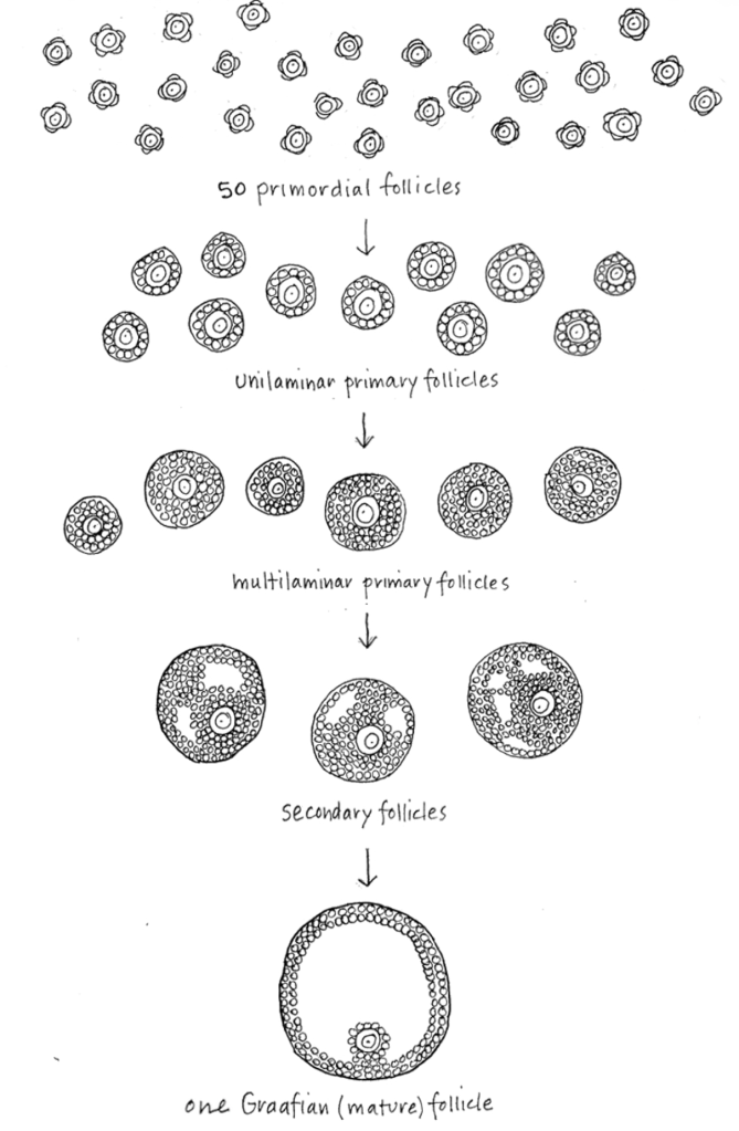 At puberty, you start “recruiting” groups of about 50 primordial follicles at the beginning of each menstrual cycle.