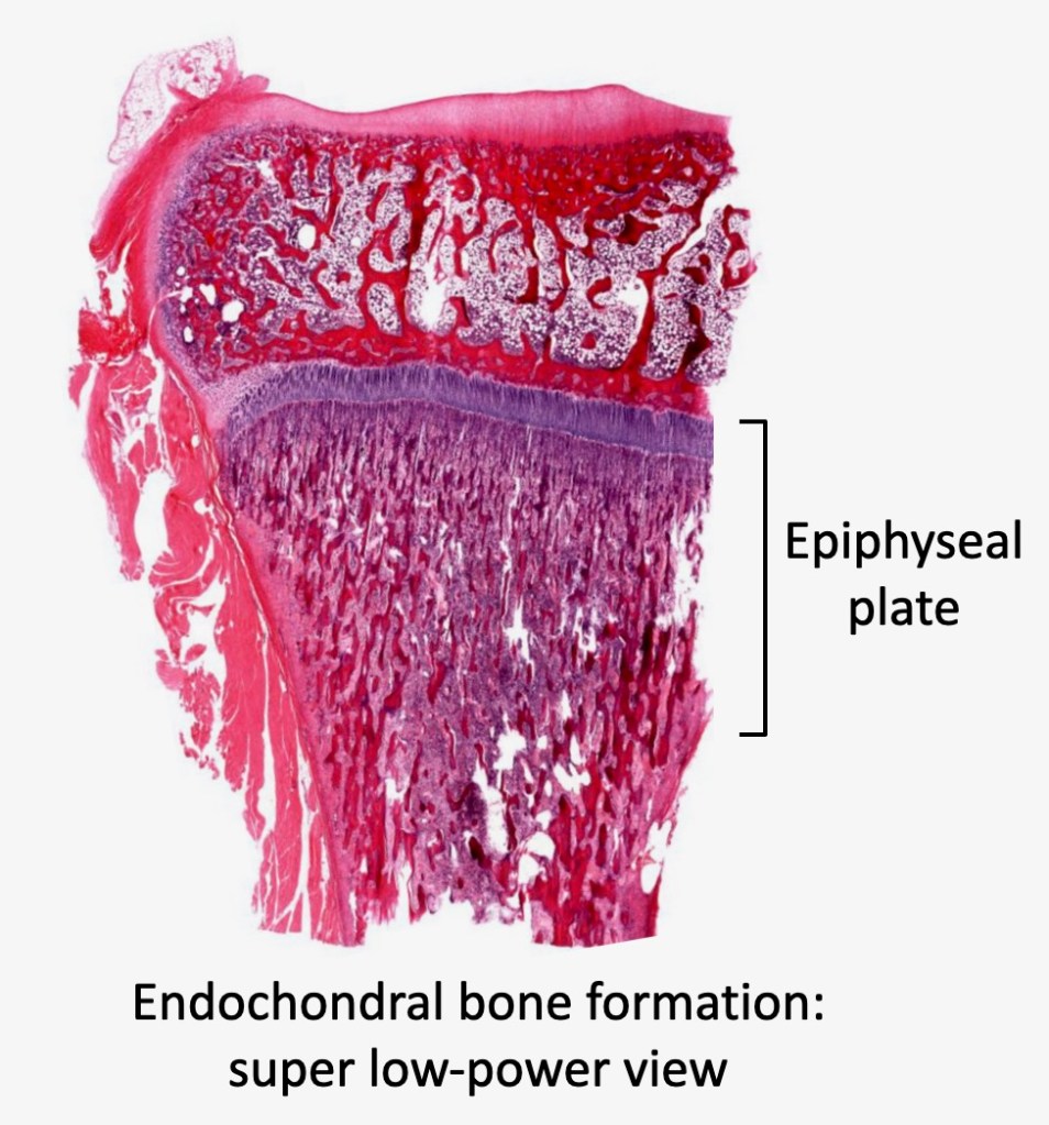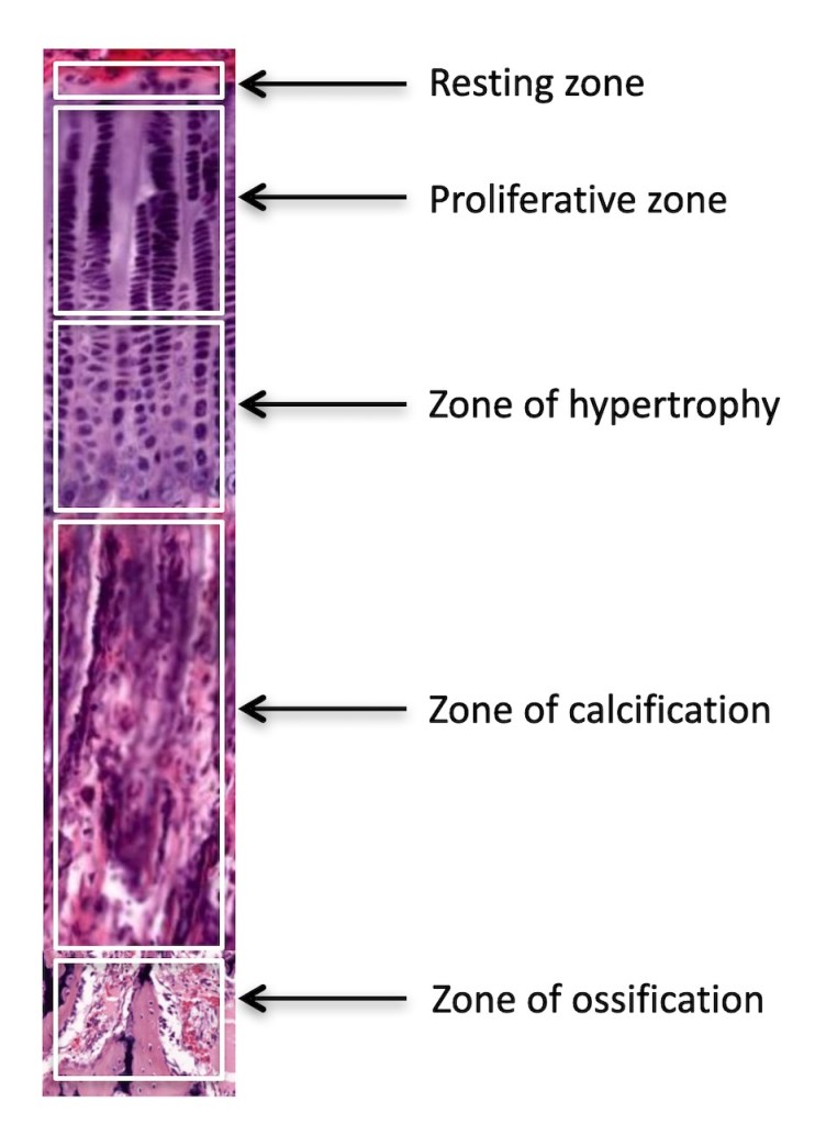 I mentioned in class that I’d put together an image showing all the layers of the epiphyseal plate with labels. Here it is!