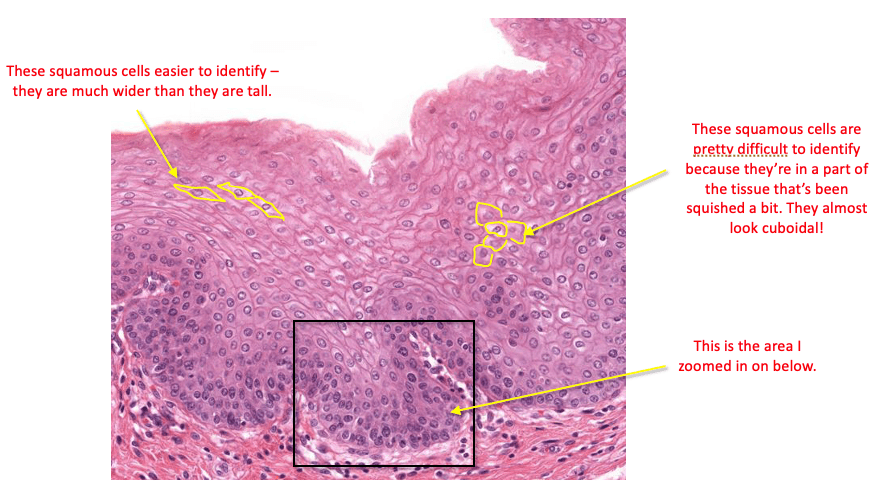 Back to your questions on the images – I made some notations to show you how I would know that the cells are squamous vs. cuboidal. Here is slide 53 with some comments: