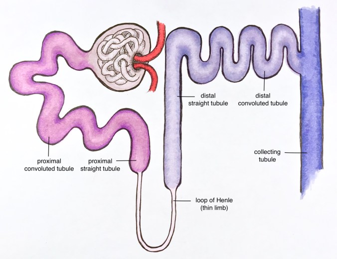 Here are the six tubular segments. I’ve simplified it a bit here (I left out the bit about how the proximal straight tubule is also called the thick descending limb of the loop of Henle, and the distal straight tubule is also called the thick ascending limb of the loop of Henle).